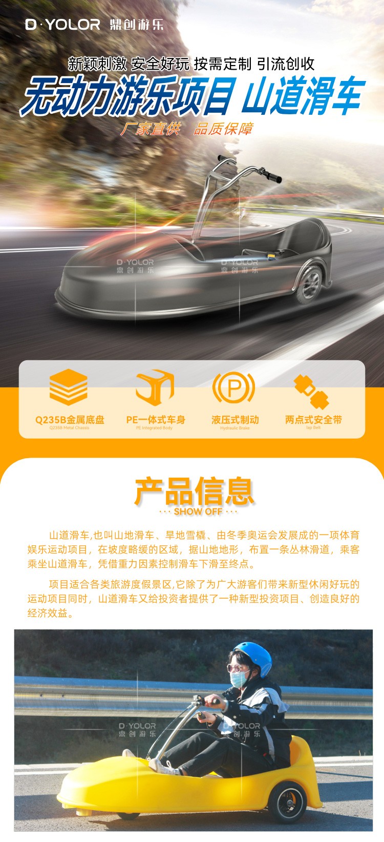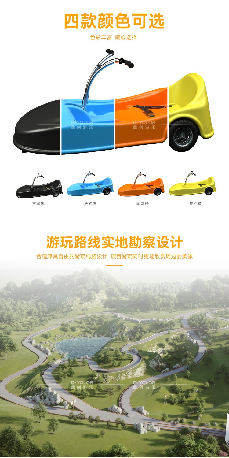 山道滑车,由冬季奥运会钢架雪车运动发展成的一项休闲娱乐项目,在坡度略缓的区域,根据地形,布置一条滑道,乘客乘坐无动力滑车,利用坡度,借助重力,控制滑车滑行至终点。它类似于赛车,项目操作简单,刺激而又安全,充满参与性和娱乐性,老少皆宜,使人流连忘返。