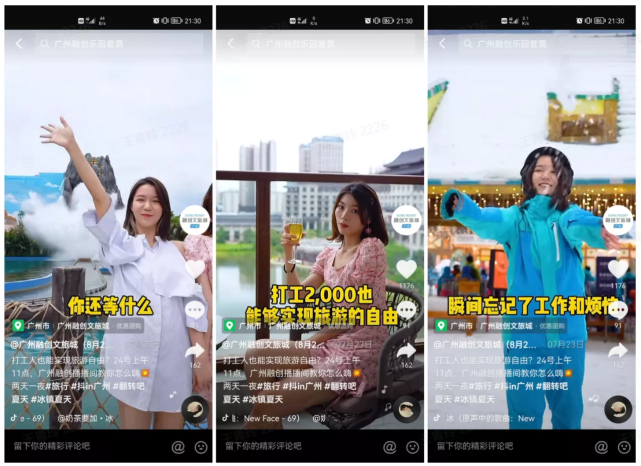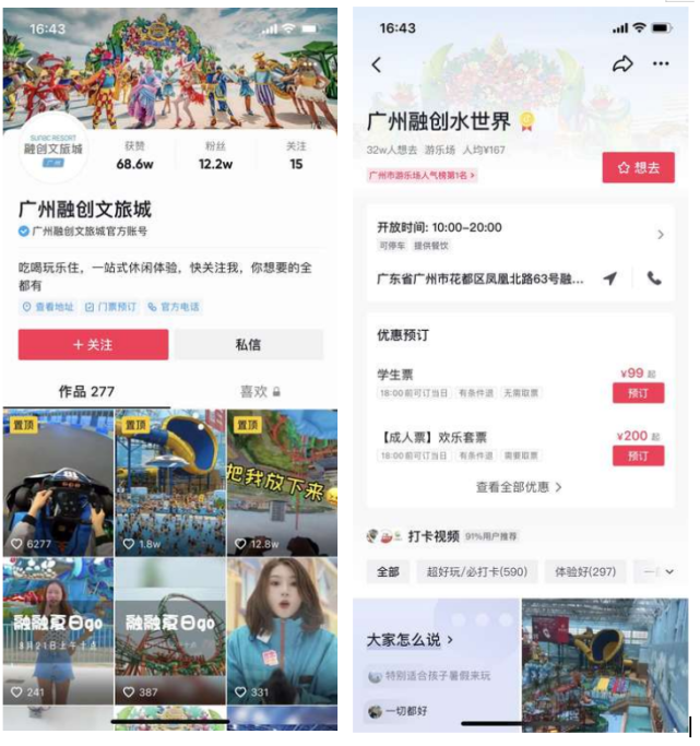 2019年,广州融创文旅城开业,察觉到了短视频快速发展的“红利”,广州融创文旅城立即开通了抖音账号,围绕文旅城的特色项目和客群兴趣,创作“有感”和“有用”的内容,让每条内容与用户是有连接的。截止目前,广州融创文旅城在抖音上共累计了12.3万的粉丝。
