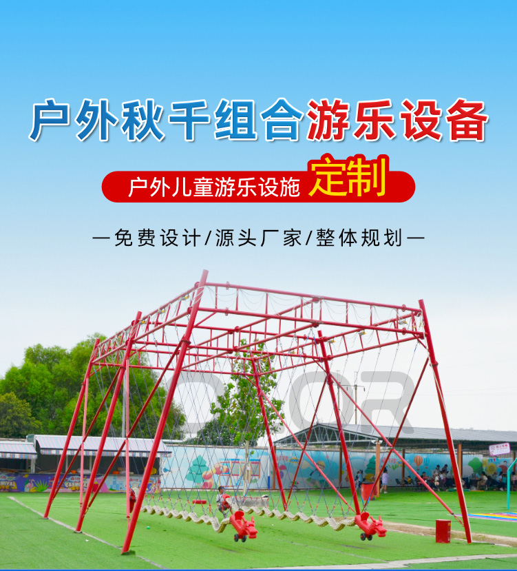 高空秋千,一般建于悬崖平台上,游客坐在秋千座椅上,绑好安全带做好防护措施。秋千从平台往外荡出,整个身体顿时脱离依靠,让人充分体验“命悬一线”的惊险刺激。 秋千规格高度有4米、6米、12米、16米、18米、20米等可供选择,可根据场地情况及需求自由组合,可设计单人乘坐、双人乘坐两种形式。