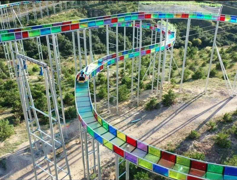 2. 玻璃水滑道是个大型的户外游乐设备,它承载量大,并且有一定高度配合,常年在户外经受风吹日晒。因此,除了滑道本体需要精心挑选外,滑道的配件设施也必须选用耐高温,防腐蚀的材质。