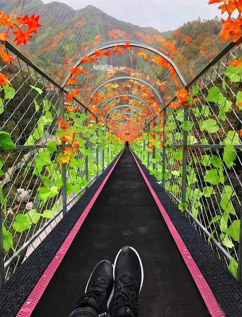 玻璃吊桥悬崖峭壁凌空而建,游客走在上面有悬空之感。游人在其上可观高山美景,看山峦起伏,绿野葱葱,秀美景色尽收眼底;伫立于悬崖峭壁之上,领略俯视大地,一望无垠的震撼感觉,心意悠然,意境浑然天成。玻璃吊桥一经推出便深受大家的喜爱。