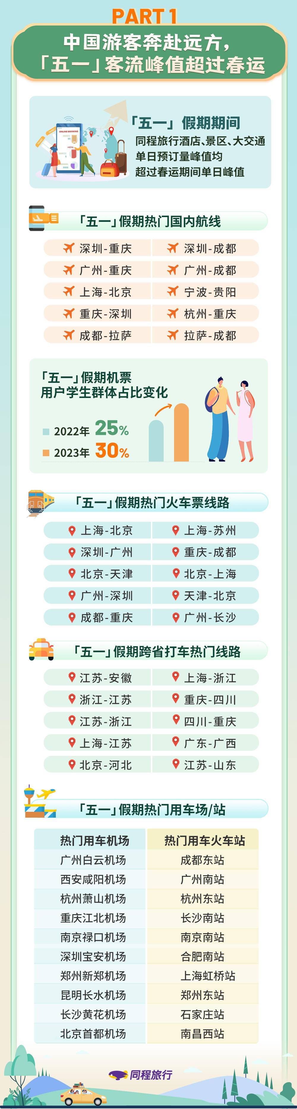 “五一”假期的出游人群中,学生群体占比显著提升,以机票订单为例,该群体的占比从去年同期的25%左右提升至今年的30%左右。相比其他游客,学生群体出游更重视性价比,他们也带动了社交媒体上“特种兵式旅游”“沉浸式旅游”等年轻化的旅行方式的流行。