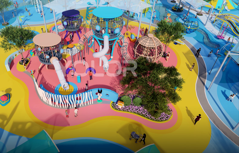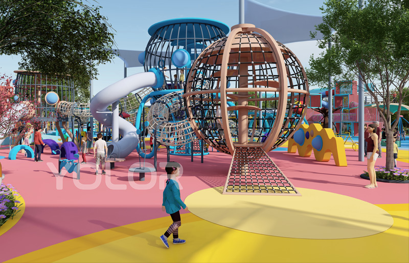 在户外公园内的游乐园主要是有外部道路以及内部道路两种,外部道路应该平整,短而直无动力乐园规划设计,以便于小朋友能够快速进入到游乐区域活动当中。使用安全材料,确保游乐设施的质量和耐用性。设立明显的安全标识,如警告牌、缓冲区等。通往无动力游乐园的道路都需要平整防滑,并且是采用保护性地面。